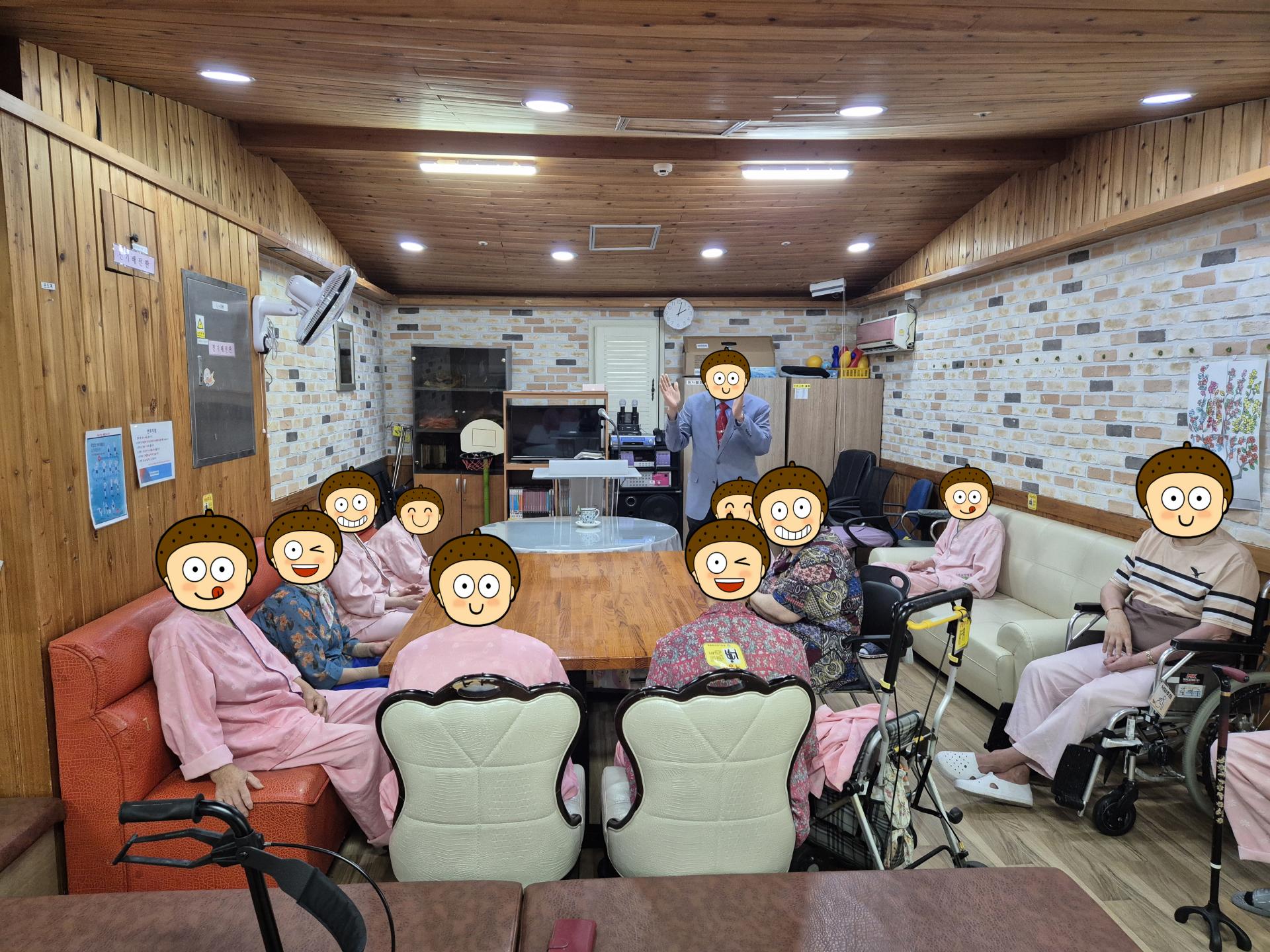 이번에 목사님을 모시고 어르신과 함께 예배 활동을 진행하였습니다! 어르신들이 즐거워하시며 예배 활동에 적극적으로 참여하셨습니다!